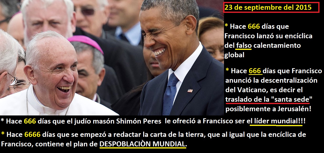 Bueno y qué con el 666? pues que hoy 23 de septiembre cuando arranca en pleno la visita del papa anticristiano Francisco, se cumplen 666 días desde que Francisco lanzó su encíclica del falso calentamiento global, se cumplen 666 días desde que el papa Francisco anunció que va a descentralizar el Vaticano y posiblemente sea precisamente en Jerusalén, para ello Israel ya se hizo al control total del monte del templo… y se cumplen además 666 días desde que el illuminati Shimón Pérez le propuso a Francisco sea el líder mundial ecuménico, político y económico.