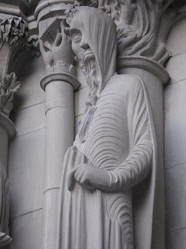 Las figuras extrañas se encuentran a los pies de los apóstoles, a los lados de la puerta principal