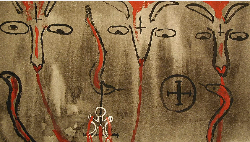 dibujos reales de víctimas de sectas satánicas… por qué una serpiente parece estar en la cabeza del sacerdote que hace la ceremonia satánica? |