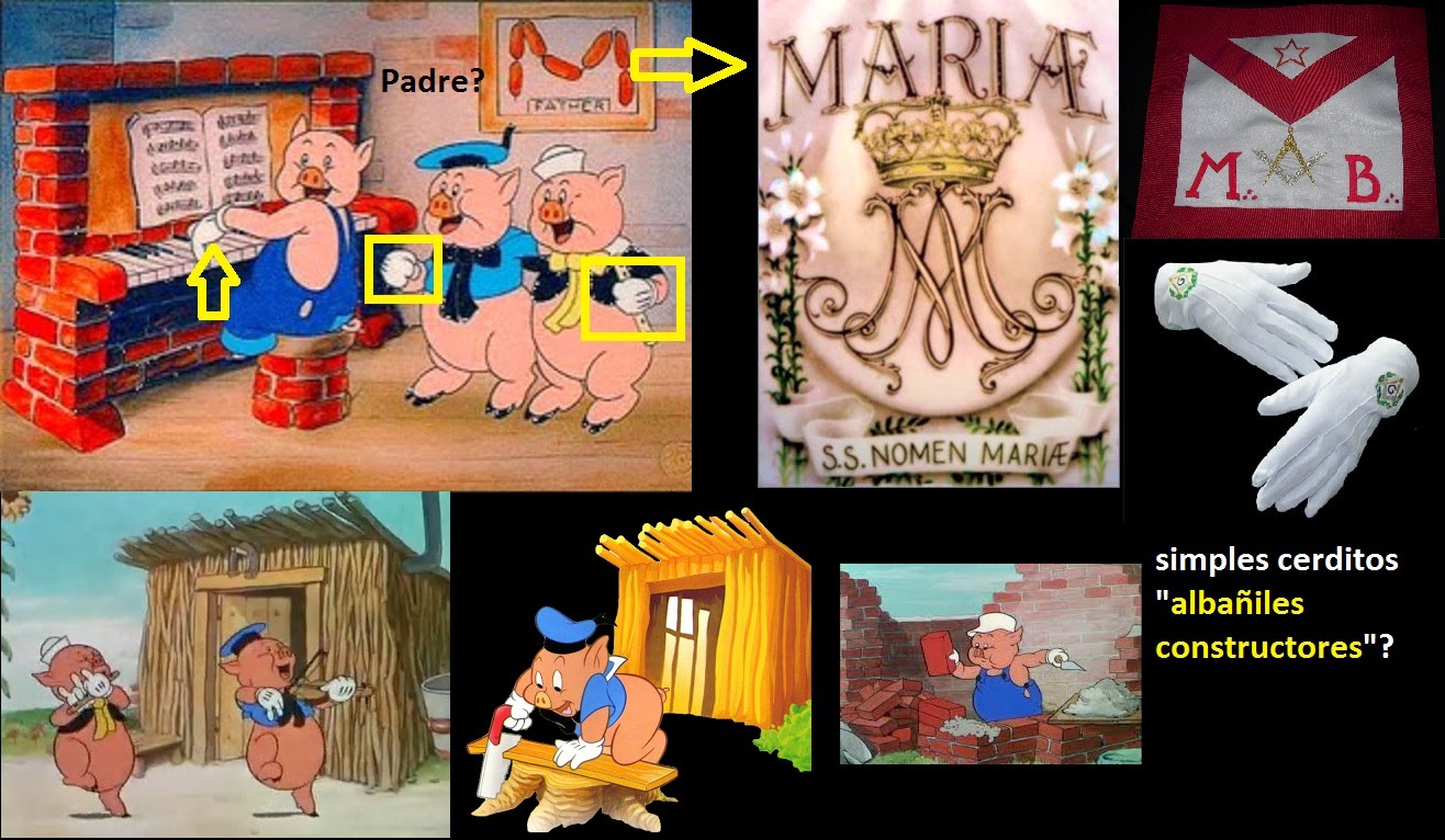 Por lo demás, los ladrillos o piedra simboliza el templo, la logia donde se reúnen los «hermanos» y se ve claramente que se trata de masones por los símbolos que se pueden ver como la M y debajo la palabra Padre, el padre su dios Gadu, la M que es la logia y los vemos a los tres con guantes blancos y al cerdito maestro lo vemos portando el gran mallete del maestro en su mano.