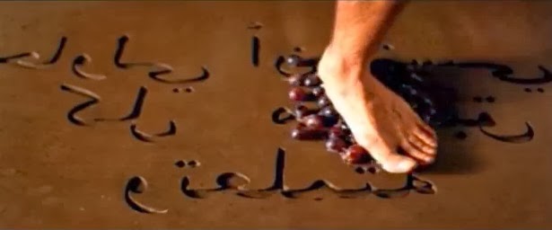 A esa virgen la vemos rodeada de dos pavos reales, uno de los símbolos que identifican expresamente también a Lucifer, un símbolo que vemos en varios videos de estas estrellitas mk ultra. Otro símbolo que aparece son unas uvas, tanto en el agua como en una mesa donde aparece un niño y que luego son pisoteadas sobre algo que está escrito en árabe حاولي أن تنسَيْ كلَّ ما سبق و تعلمتِه y que dice: TRATA DE OLVIDAR LO QUE HAS APRENDIDO