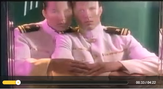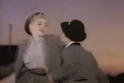 Luego vemos al tipo que había entrado al cuarto con Madonna en otra imagen homosexual formando un cuarteto con unos tipos en un sofá como si fueran fantasías sexuales de la mente de Madonna o de él e inmediatamente sale Madonna pitada del cuarto, muerta de risa algo pícara e inocentona y corriendo con su maleta.