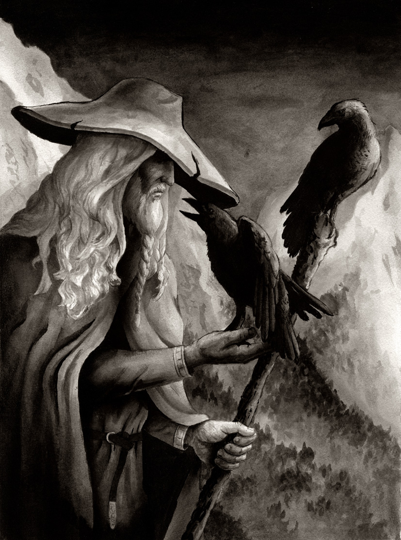 | Odín, dios de un solo ojo acompañado de sus cuervos (demonios) |