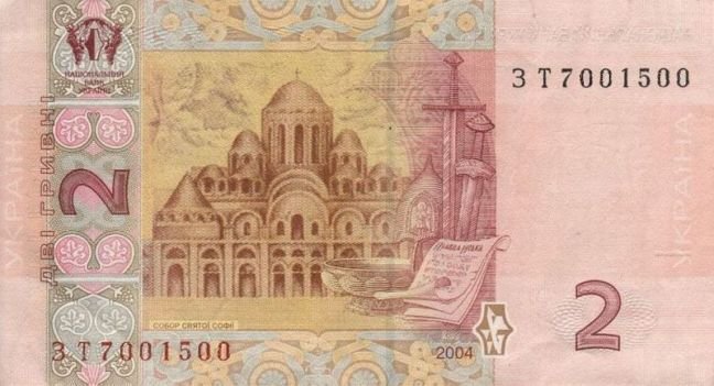 2 UAH 63 x 118 mm Tonalidad: marrón. Anverso: el duque Yaroslav el Sabio. Reverso: la catedral de Santa Sofía en Kiev.