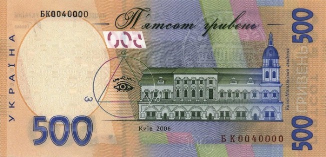 500 UAH –> 75 x 154 mm Tonalidad Amarillo brillante Anverso: Retrato de Grigory Skovoroda, gran filósofo y científico en la parte central de la imagen una fuente con la inscripción «igualdad desigual a todos». Reverso: Edificio de la Academia de Kiev-Mohyla.